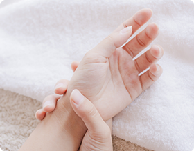 手には親指から薬指までの感覚を支配する正中神経が通っています。そして、手関節の部分でこの神経を覆っているトンネルが手根管です。手根管症候群は、正中神経が何らかの理由で手根管に圧迫されることで起こります。症状としては、手がしびれたりやチクチクと痛み、また物を掴みにくくなったりします。しびれは首の神経の狭窄による場合もあります。