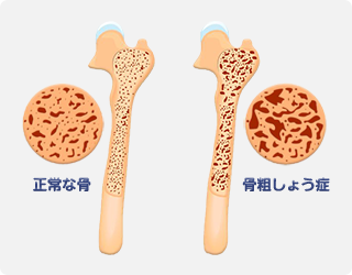 骨祖しょう症は、骨量(骨の質量、カルシウムやコラーゲンなど)が減少し、まるでスポンジのように骨がスカスカになることで、骨が脆くなる疾患を言います。主な原因は加齢やカルシウム不足をはじめ、運動不足、喫煙や飲酒、閉経(女性ホルモンの減少)などです。