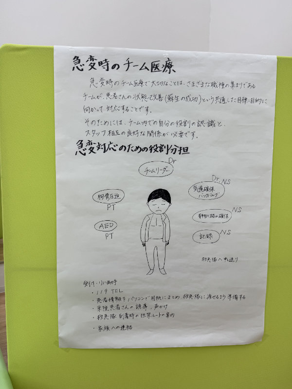人体模型を利用して実際に胸骨圧迫(昔の言い方では心臓マッサージ)の手技や、AED(自動体外式除細動器)の使用方法などを職員みんなで共有しました。