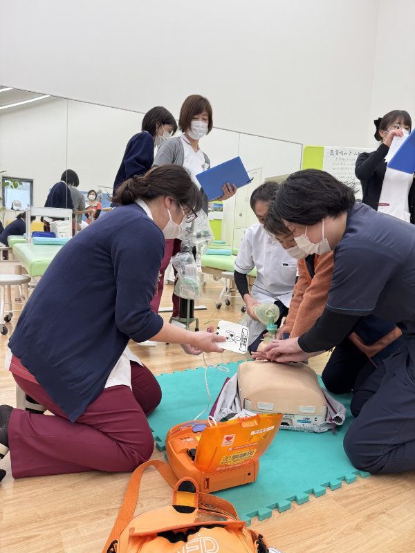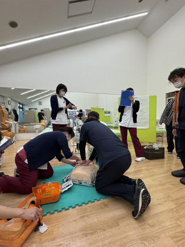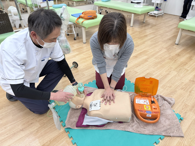 胸骨圧迫(いわゆる心臓マッサージ)の練習とAED(自動体外除細動器)の使用方法の確認などをスタッフ全員で共有しました。